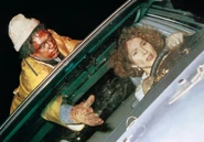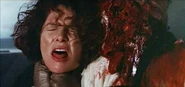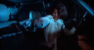 Miles away from the scene, Annie stops along the road and begins thinking about what she has done and the consequences involved, but she ultimately concludes that no one has anything on her and thinks everything will be fine. Before she can continue, however, the hitchhiker she killed suddenly appears outside her window and utters "Thanks for the ride, lady." The frightened Annie then speeds off in terror, but everywhere she goes, the hitchhiker always reappears and becomes her tormentor throughout the trip as she repeatedly runs him over, hurls off the top of her car, slams his body into trees, etc. as he only gets more and more battered and bloody without dying. She eventually loses control of her car drives off the road and down a hill, knocking herself out.