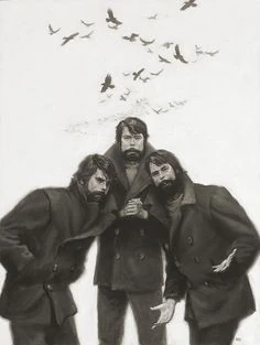 Artist Michael Whelan's drawing of Rando Thoughtful and his friends disguised as Stephen King.